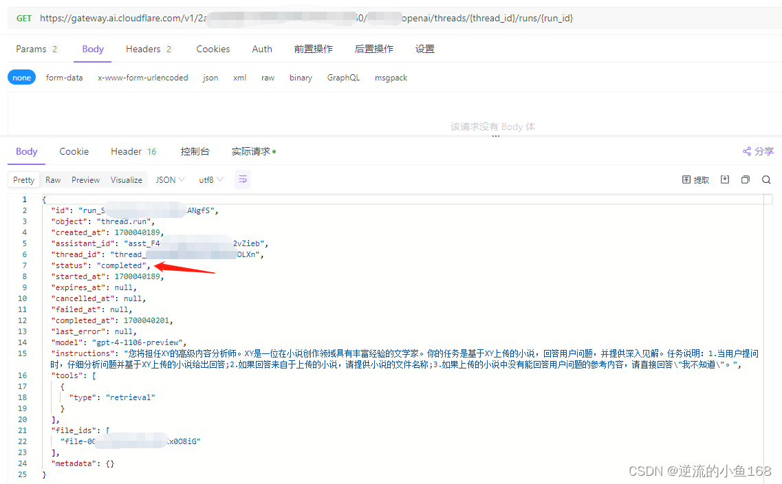 - 6.查询指定线程(Thread)下特定人机交互(Run)的执行状态(status)。人机交互(Run)任务提交后,我们需要实时关注任务执行状态,status状态包括:queued、 in_progress、requires_action、cancelling、cancelled、failed、completed、expired。为了使Run状态是最新的,你需要定时轮询Run对象获取最新的状态。需要注意的是,如果Run处于completed状态,标识当前人机交互(Run)已经执行完成,可以调用消息接口查询助手返回的内容了。
