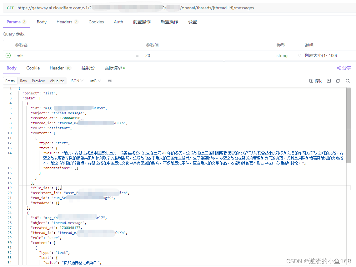 - 7.查询指定线程(Thread)的消息列表,返回的消息列表默认按时间降序排列,limit最大支持100。需要说明的是:Thread中可以存储的message数量没有限制,但是一旦message的大小超过模型的上下文窗口限制,Thread将尝试包含尽可能多的适合上下文窗口的message并删除最旧的message。