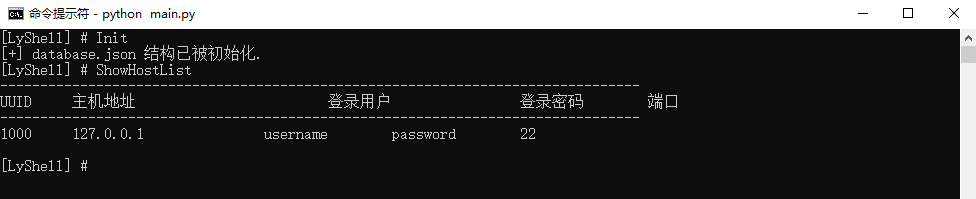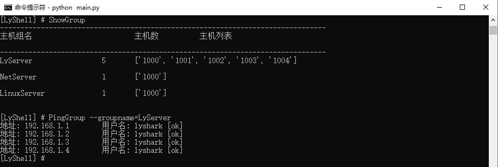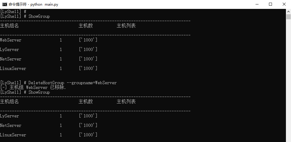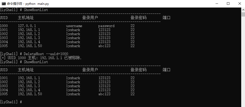 )中的主机信息和主机分组信息。用户通过输入命令来执行不同的操作,如初始化数据库、显示主机列表、添加主机、修改主机信息、删除主机等。