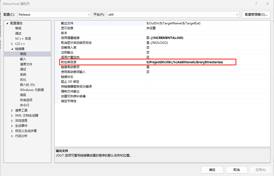 不过我更喜欢在代码里用#pragma comment(lib, "detours.lib")来引入lib库,因为这样可以根据宏来分别引入Debug还是Release的lib