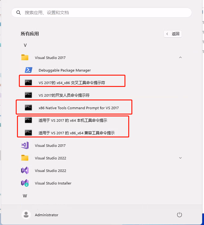 visual studio的命令行在开始菜单里打开,上面两个是x86的,下面两个是x64的,至于x64和x86_x64有啥区别我就不清楚了,因为测试编译的时候没什么不一样的,就懒得去搜了。