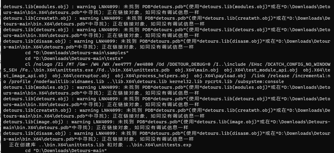 那么只需要在编译之前执行下set DETOURS_CONFIG=Debug就可以编译成Debug版本的了,会生成一个lib.X64Debug目录,里面编译出来的lib就有了pdb文件