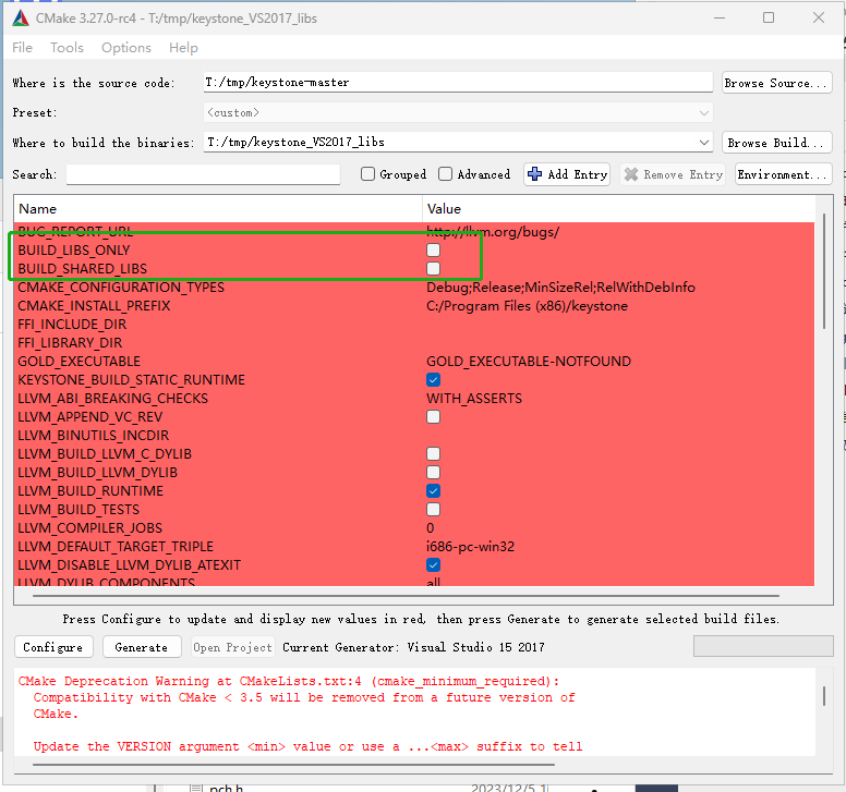 这里只需要关注这两个配置,第一个是仅编译lib库,勾选上。第二个是编译dll,我用不到dll就不勾选了,如果勾选了则不会生成lib库了。然后点击Generate,接着就可以点Open Project打开项目了