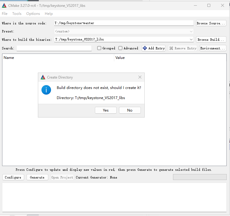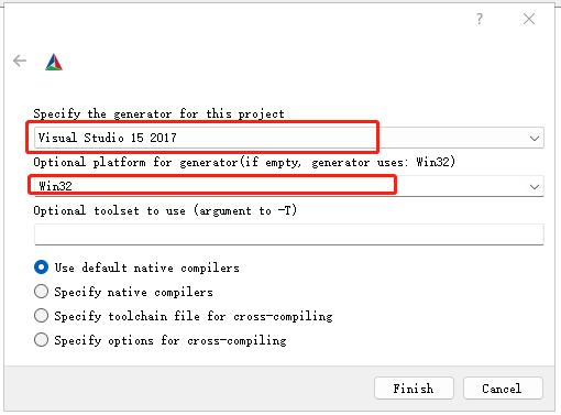 因为我填写的路径不存在,提示我是否创建,点Yes, 接着会弹出一个选择Visual Studio的版本,这里我选择2017,平台选择Win32,也就是32位(x86),接着点Finish