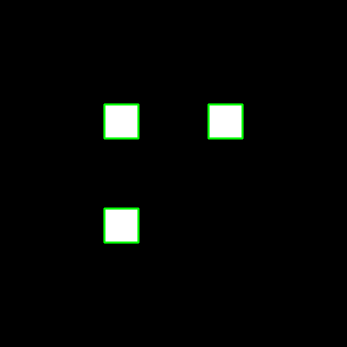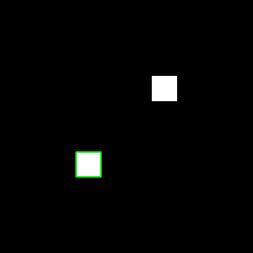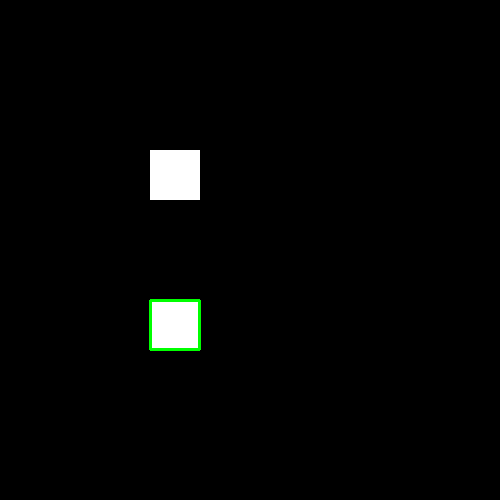 1、当水平方向位移量不同,垂直方向位移量相同时,右方的白块会被优先检测到,我们绘制出index为0的轮廓(绿色):
