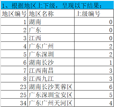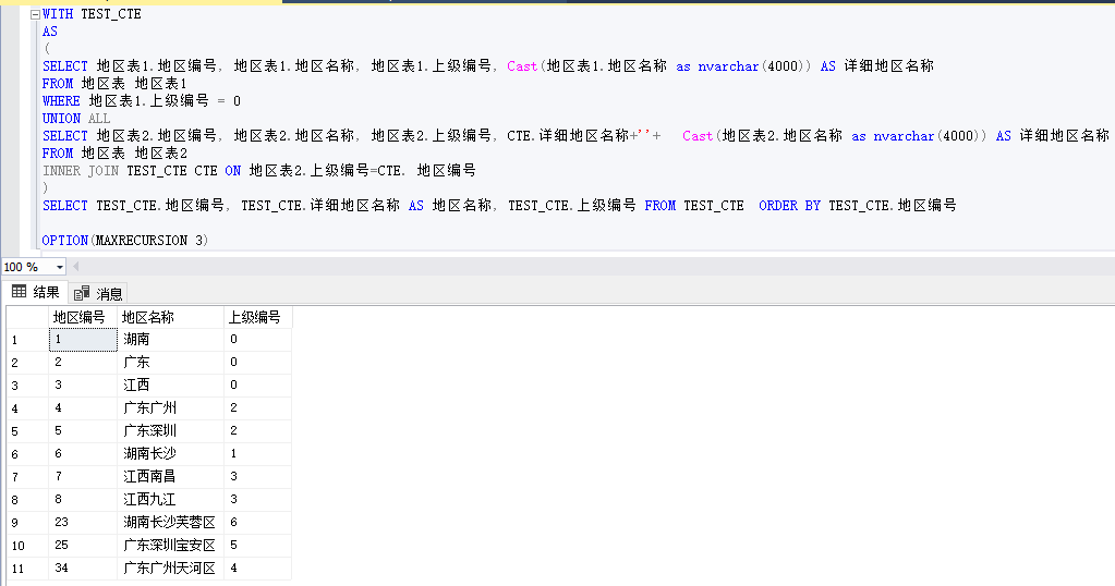 WITH TEST_CTE AS ( SELECT 地区表1.地区编号, 地区表1.地区名称, 地区表1.上级编号, Cast(地区表1.地区名称 as nvarchar(4000)) AS 详细地区名称 FROM 地区表 地区表1 WHERE 地区表1.上级编号 = 0 UNION ALL SELECT 地区表2.地区编号, 地区表2.地区名称, 地区表2.上级编号, CTE.详细地区名称+''+ Cast(地区表2.地区名称 as nvarchar(4000)) AS 详细地区名称 FROM 地区表 地区表2 INNER JOIN TEST_CTE CTE ON 地区表2.上级编号=CTE. 地区编号 ) SELECT TEST_CTE.地区编号, TEST_CTE.详细地区名称 AS 地区名称, TEST_CTE.上级编号 FROM TEST_CTE ORDER BY TEST_CTE.地区编号 OPTION(MAXRECURSION 3)