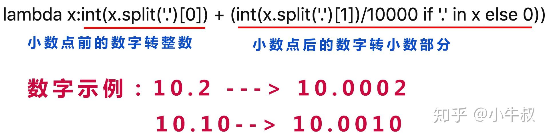 1 >>> a = ['10','1.1','1','2','1.3','3','2.10','2.2'] 2 >>> sorted(a) 3 ['1', '1.1', '1.3', '10', '2', '2.10', '2.2', '3'] 4 >>> sorted(a,key = lambda x:int(x.split('.')[0]) + (int(x.split('.')[1])/10000 if '.' in x else 0)) 5 ['1', '1.1', '1.3', '2', '2.2', '2.10', '3', '10'] 6 >>>
