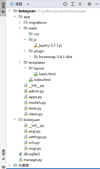 ③、在templates下新建app文件夹,app文件夹下新建layout文件夹,用来存放网页模板。