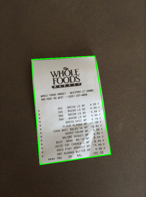 1 def edge_detect(image): 2 gray = cv2.cvtColor(image, cv2.COLOR_BGR2GRAY) 3 edges = cv2.Canny(gray, 100, 200) 4 contours, hierarchy = cv2.findContours(edges.copy(), cv2.RETR_TREE, cv2.CHAIN_APPROX_SIMPLE) 5 conts = sorted(contours, key=cv2.contourArea, reverse=True)[:5] 6 for c in conts: 7 peri = cv2.arcLength(c, True) 8 approx = cv2.approxPolyDP(c, 0.02*peri, True) 9 if len(approx) == 4: 10 ss = approx 11 cv2.drawContours(image, [ss], -1, (0, 255, 0), 2) 12 cv2.imshow('', image)
