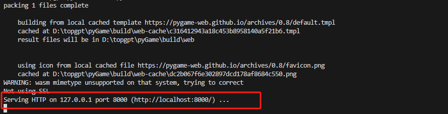 ,这里注意下,pygbag打包的是整个目录,所以不能像Python那样启动,所以我基本上都是回退到父级目录后,在进行终端控制台打包。命令会直接在本地启动游戏服务。你稍等片刻。