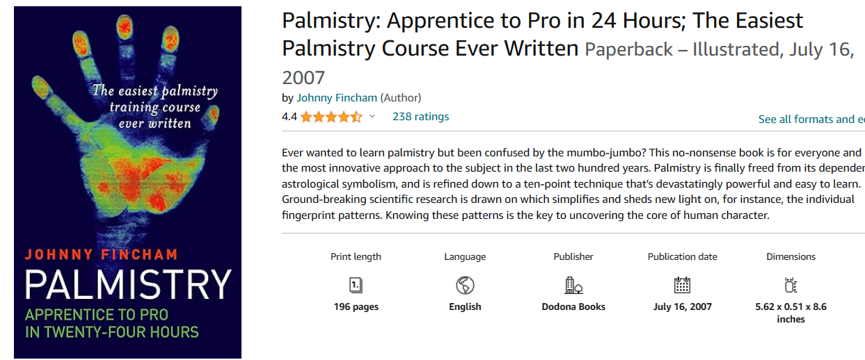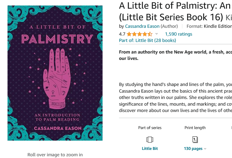 这本书最好的地方在于,它有很多我在网上或我已经购买的手相书库中没有读到的信息。因此,我觉得这是一本令人兴奋的读物,它重新点燃了我内心学习一切有关手相学知识的热情。