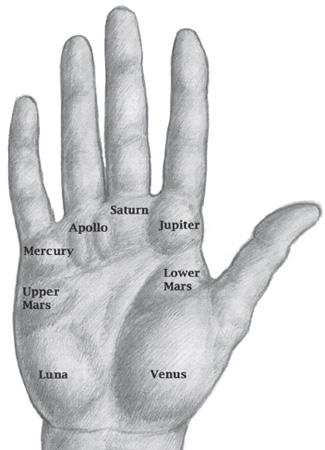 星座是在手掌表面起伏的肉垫。七个星座的名称让人想起古人通常所说的七大行星以及希腊和罗马神话中的众神。这些名称也标识了每根手指的底部都有一个星座。