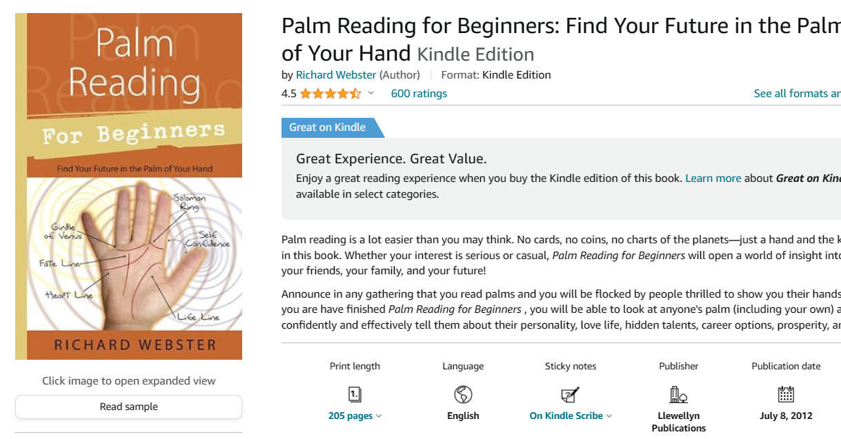 其他优点:大量的图片和视觉效果,通俗易懂的解释,提供了有关手相术各个方面的信息。当我阅读手相书籍的评论时,这本书一再被提及。很多人都从这本书中寻找答案,因为它包含了大量的信息。真的没有比它更完整的了。