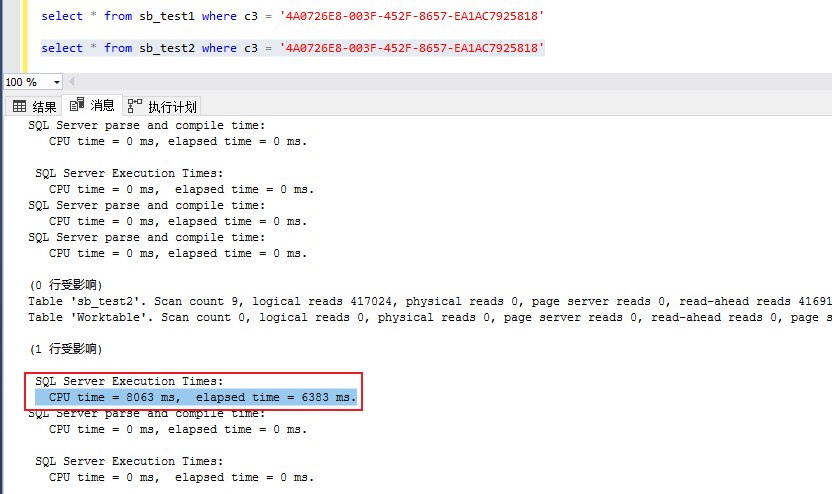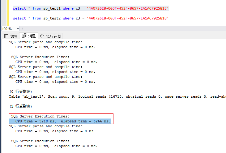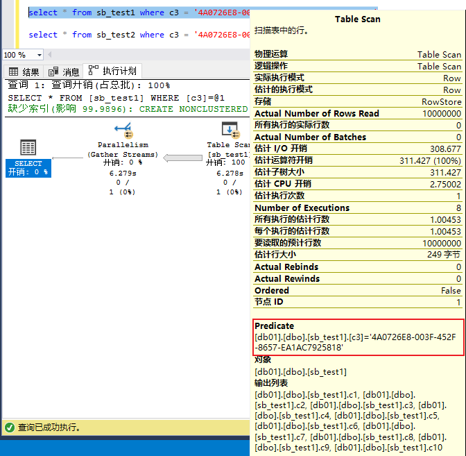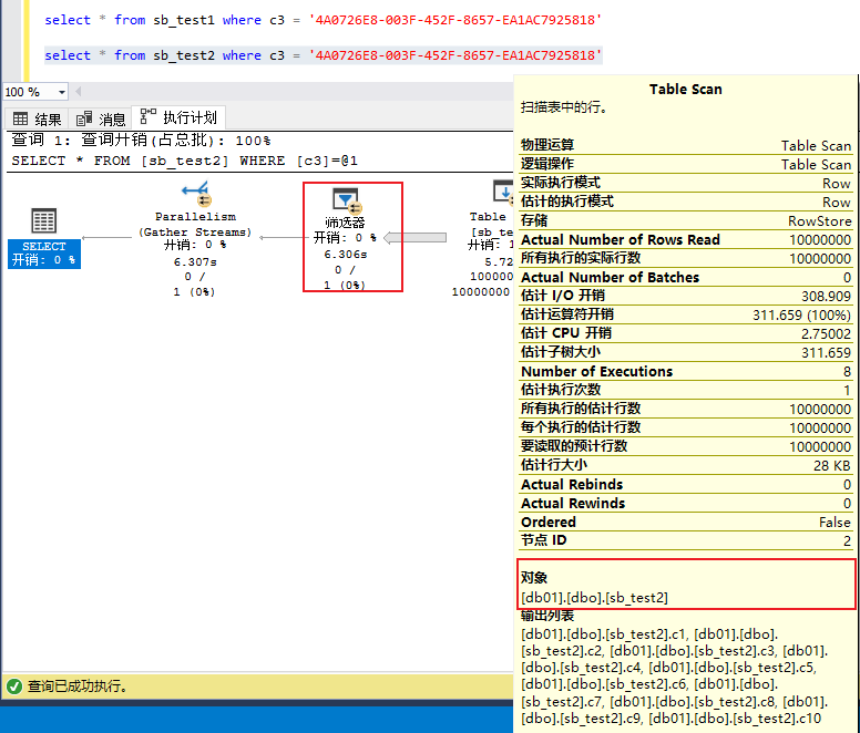 以上新建两张表结构和数据一样的表,sb_test1表字段用varchar(50),sb_test2表字段用varchar(max),都是1000W行数据。