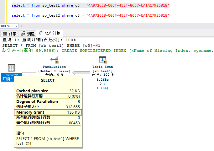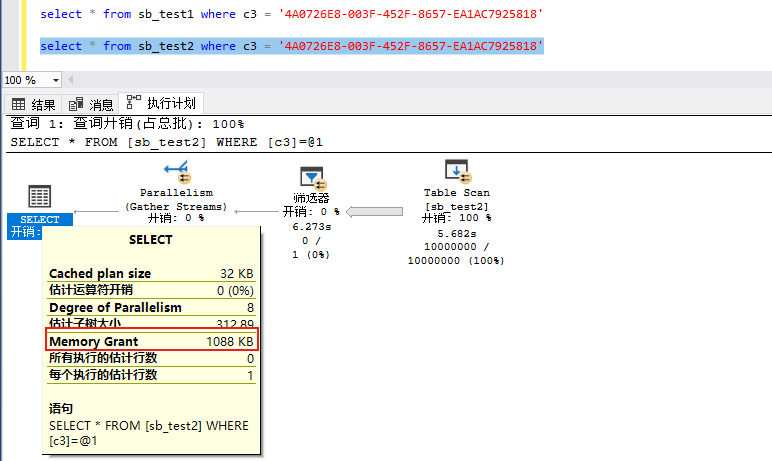 1,对于同一个查询,执行计划的Memory Grant明显不一样,varchar(max)类型字段的表的执行计划内存(memory grant)明显要高很多。