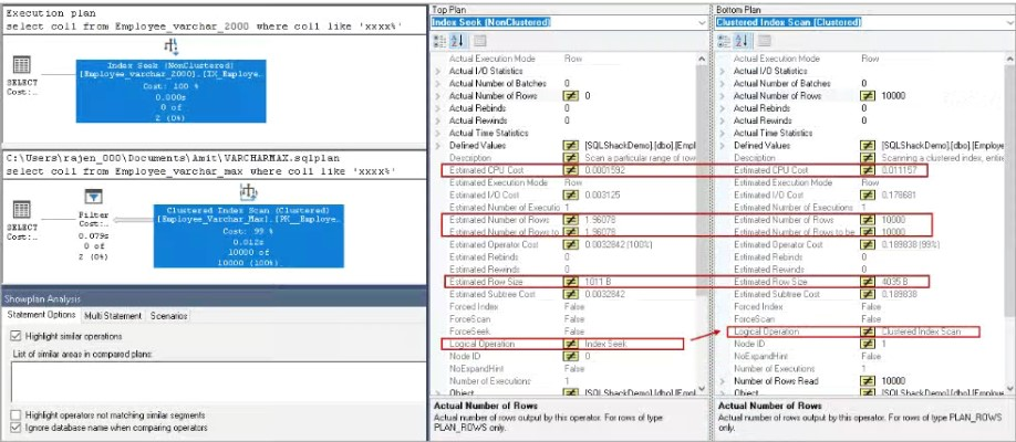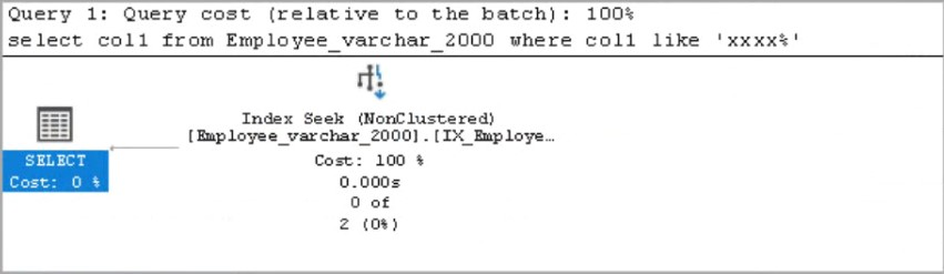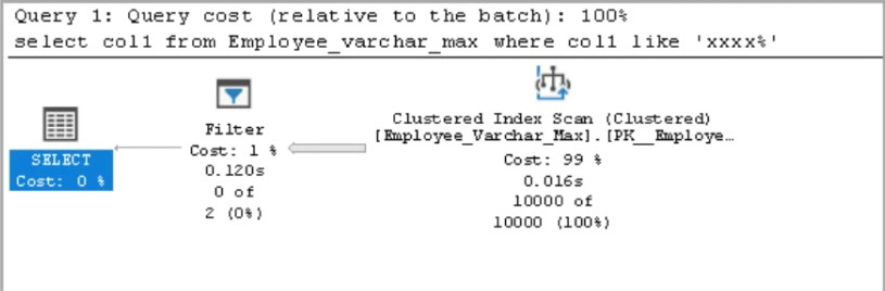 如果我们使用varchar(max)数据类型运行相同的查询,它会使用聚集索引扫描操作符,并且根据表中的行数,它可能是一个资源密集型操作符。