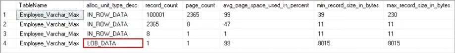 重新运行查询以检查分配单元。我们获取LOB_Data分配单元,以便在Employee_Varchar_Max表中存储超过8000字节的数据。我们在IN_Row_DATA分配单元中有一个指向此数据的指针。