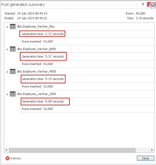 让我们将10,000条记录插入到我们之前创建的每个表中。我们想检查数据插入时间。您可以使用ApexSQL Generate工具插入数据,而无需编写T-SQL代码。