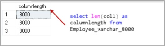 Use SQLShackDemo go SELECT LEN(col1) AS columnlength FROM Employee_varchar_2000; SELECT LEN(col1) AS columnlength FROM Employee_varchar_4500; SELECT LEN(col1) AS columnlength FROM Employee_varchar_8000; SELECT LEN(col1) AS columnlength FROM Employee_varchar_max;