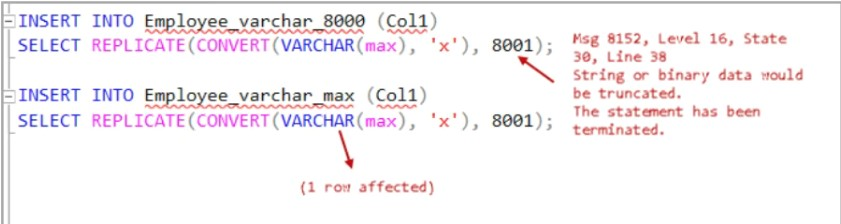 INSERT INTO Employee_varchar_8000 (Col1) SELECT REPLICATE('A', 8001); Go INSERT INTO Employee_varchar_8000 (Col1) SELECT REPLICATE('A', 10000);