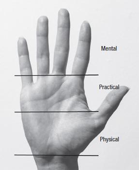 从手掌的整体来看,手掌被分为三个部分,称为手相的三个世界:心理世界、实践世界和物理世界。