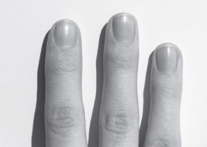 皮肤的纹理和指甲的纹理应该一致。如果皮肤的纹理细腻,我们希望指甲的纹理也能细腻,光滑如丝。如果皮肤质地适中,我们希望指甲光滑但结实柔韧。粗糙的皮肤会产生粗糙的指甲,质地有点颗粒状。如果指甲和皮肤的质地不匹配,你就必须像侦探一样寻找原因。例如,皮肤细腻的人可能会有颗粒状、脱皮的指甲。在这种情况下,这个人可能生性敏感、文雅,但也可能精神高度紧张。注意指甲是垂直成脊状还是凹槽状。