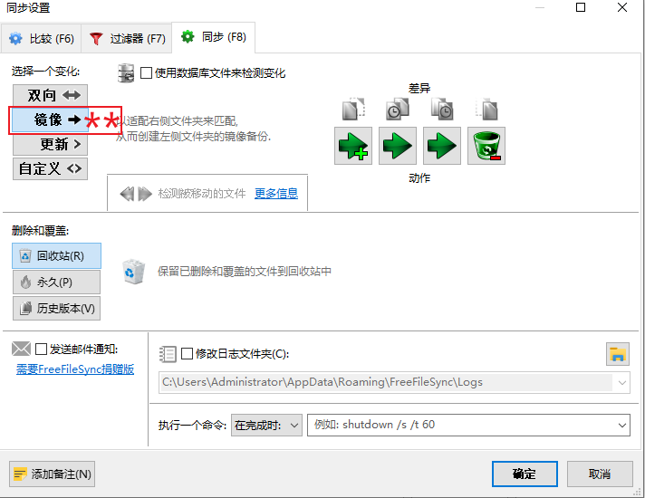 第3个,同步,也就是选你需要的同步类型,有双向同步,有单向镜像copy,也有更新,还可以自定义,这里我使用的是镜像,就是把原文件copy一份到新服务器中。