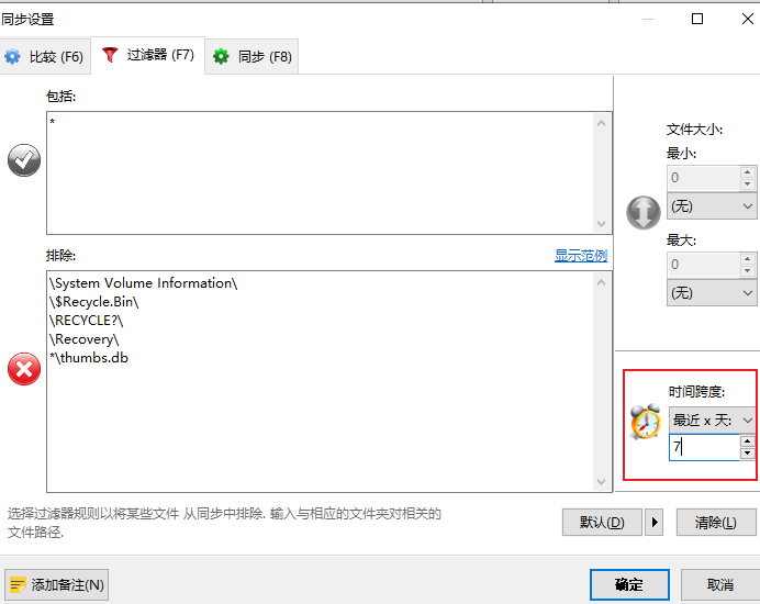 第2个,筛选,这里可以使用其功能进行保留哪一些文件或者哪一些日期进行备份;我使用的是时间跨度选择来进行七天以内的进行镜像备份,一开始我想的是全部备份,在通过脚本去删除其余的,但是我发现脚本在访问其他服务器的时候无法进行删除,试了很多操作都没有成功,如有人知道怎么解决的话,我会非常欢迎!