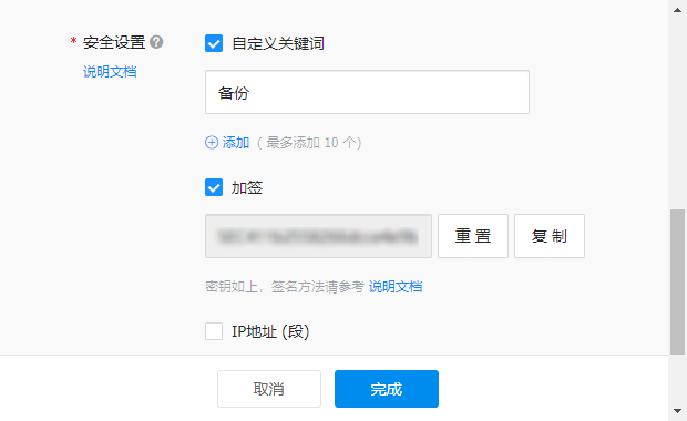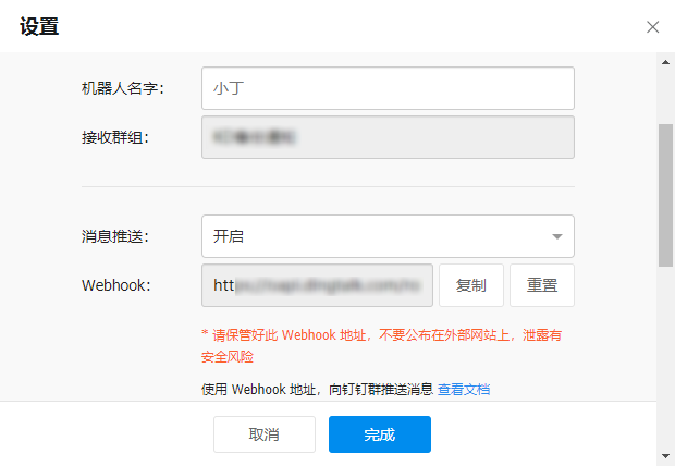 钉钉群里自定义机器人,消息推送开启,记住WebHook、加签密钥(可选)和自定义关键字(这很重要,在消息发送的时候需要存在自定义的关键字)