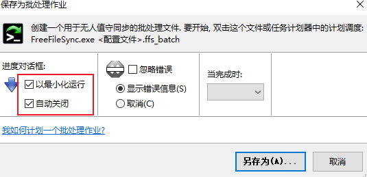 第1个,需要另存为批处理作业,在设置的时候勾选最小化运行和自动关闭,在定期执行之后不会弹出其运行页面了。