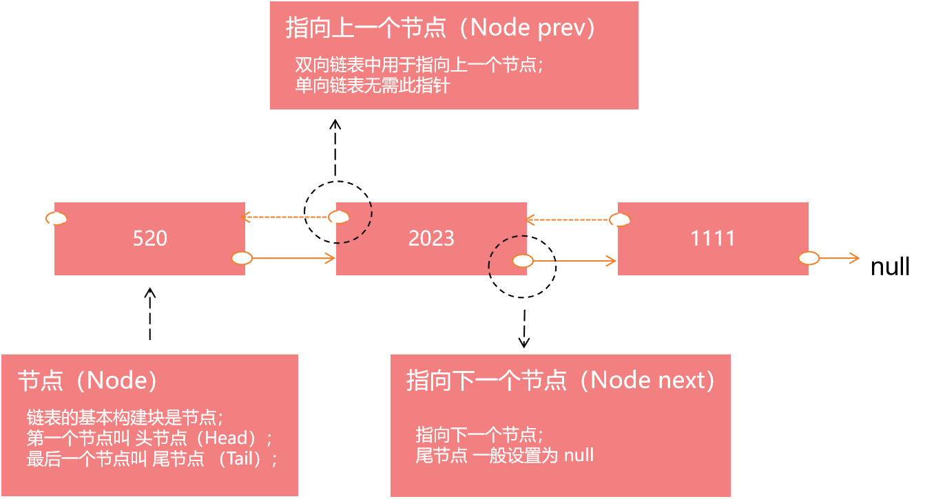 - 节点(Node): 链表的基本构建块是节点,每个节点包含两(三)部分,即 数据 element 和 指向下一个节点的指针 next(指向上一个节点的指针 prev)。