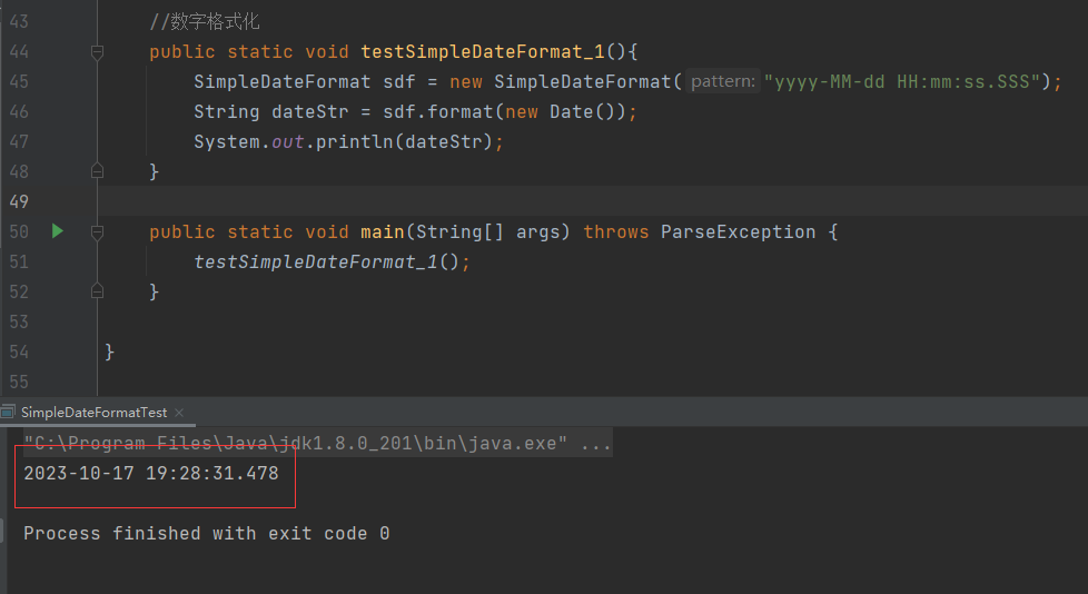 //数字格式化 public static void testSimpleDateFormat_1(){ SimpleDateFormat sdf = new SimpleDateFormat("yyyy-MM-dd HH:mm:ss.SSS"); String dateStr = sdf.format(new Date()); System.out.println(dateStr); } public static void main(String[] args) throws ParseException { testSimpleDateFormat_1(); }