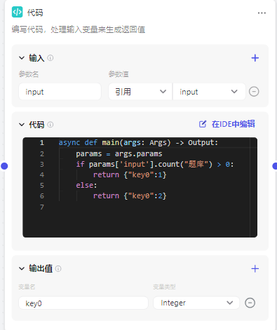 如果你对编程不太熟悉的话,可以考虑使用大模型节点来代替,让大模型直接进行判断,并按照固定格式将结果输出到指定的key中。这样可以简化操作流程,减少对编程的依赖。下面有演示。
