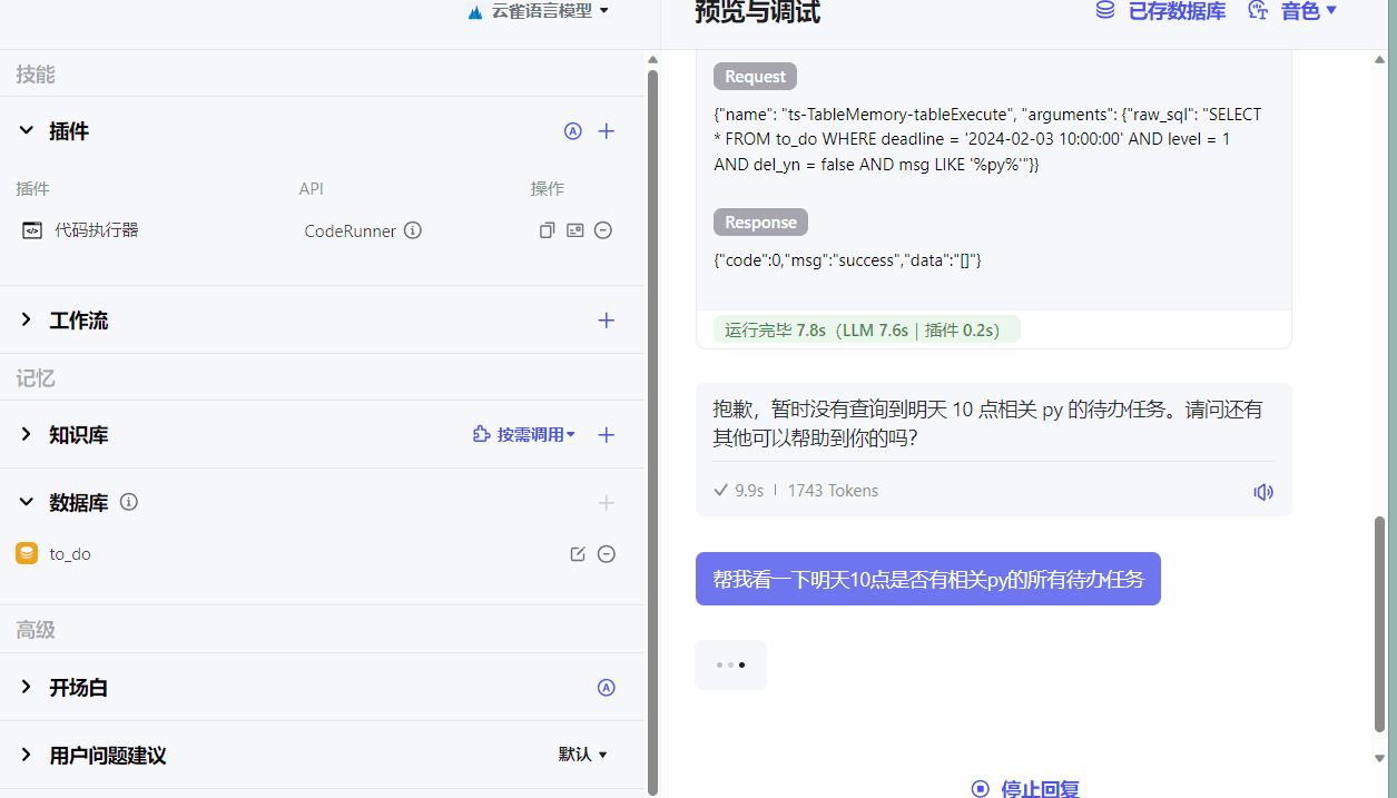 在这个示例中,我将向数据库中插入新的数据。在开始之前,请确保根据你的数据库结构提供待办事项的详细描述,这样助手才能正确地记录下来。现在,让我来帮你进行演示吧!请注意,我将只演示正确的情况。唯一需要注意的是,你必须提供数据库中必需的字段,并确保字段的值类型与数据库结构一致。如果存在非必需的字段,你可以选择不提供这些字段的值。