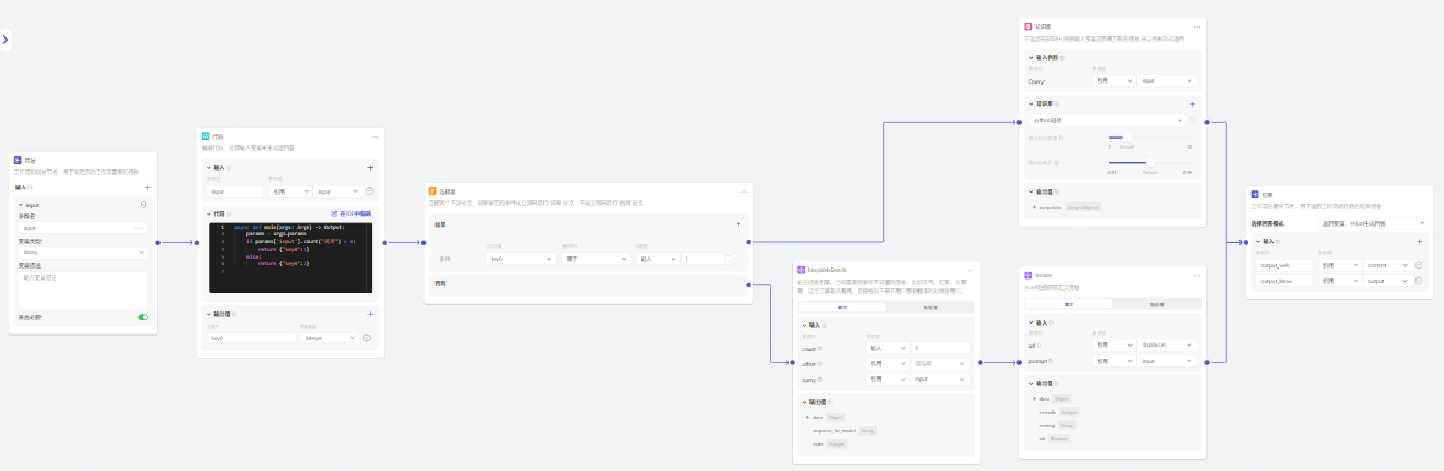 节点类型包括大型模型、插件、选择器、代码和知识库等。这些节点在工作流中扮演不同的角色,共同构建出一个完整而多元化的系统。