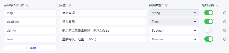 - String表示该字段类型是一串文本形式的数据,比如”今天吃啥?”,在我的示例中,我用它来保存我的待办内容。