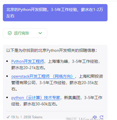 2:当用户询问Python招聘信息时,请调用job工作流处理。