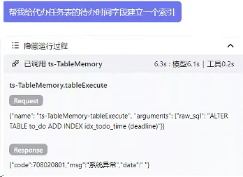 既然我们在使用数据库,它自然拥有增加、删除、修改和查询的功能。下面我将演示如何使用AI助手来优化数据库维护。然而,在这里我想吐槽一下,既然是数据库,在调试时至少应该给管理用户一些操作权限。即使用户输入错误的数据导致报错,我们可以限制用户的新增数据权限,但是删除操作应该是可以由我自行执行的。然而,事实上,用户没有任何操作权限,一切都由AI助手独自操作。