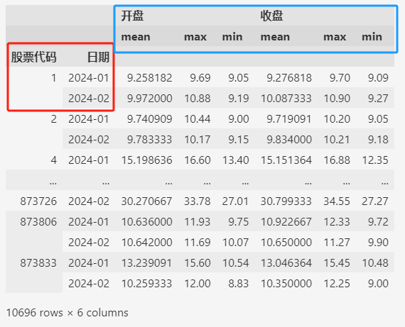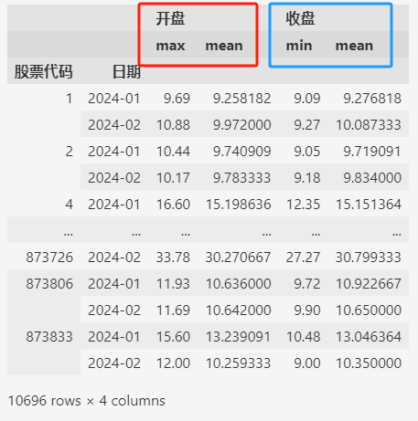 比如,下面的示例一次汇总出每支股票每个月开盘价和收盘价的最大值,最小值,平均值: