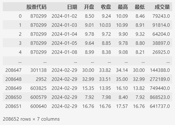 df = df.loc[:, ["股票代码", "日期", "开盘", "收盘", "最高", "最低", "成交量"]]