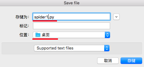 在弹出的对话框里输入文件名,以 .py 为后缀,选择存放位置,点击存储。