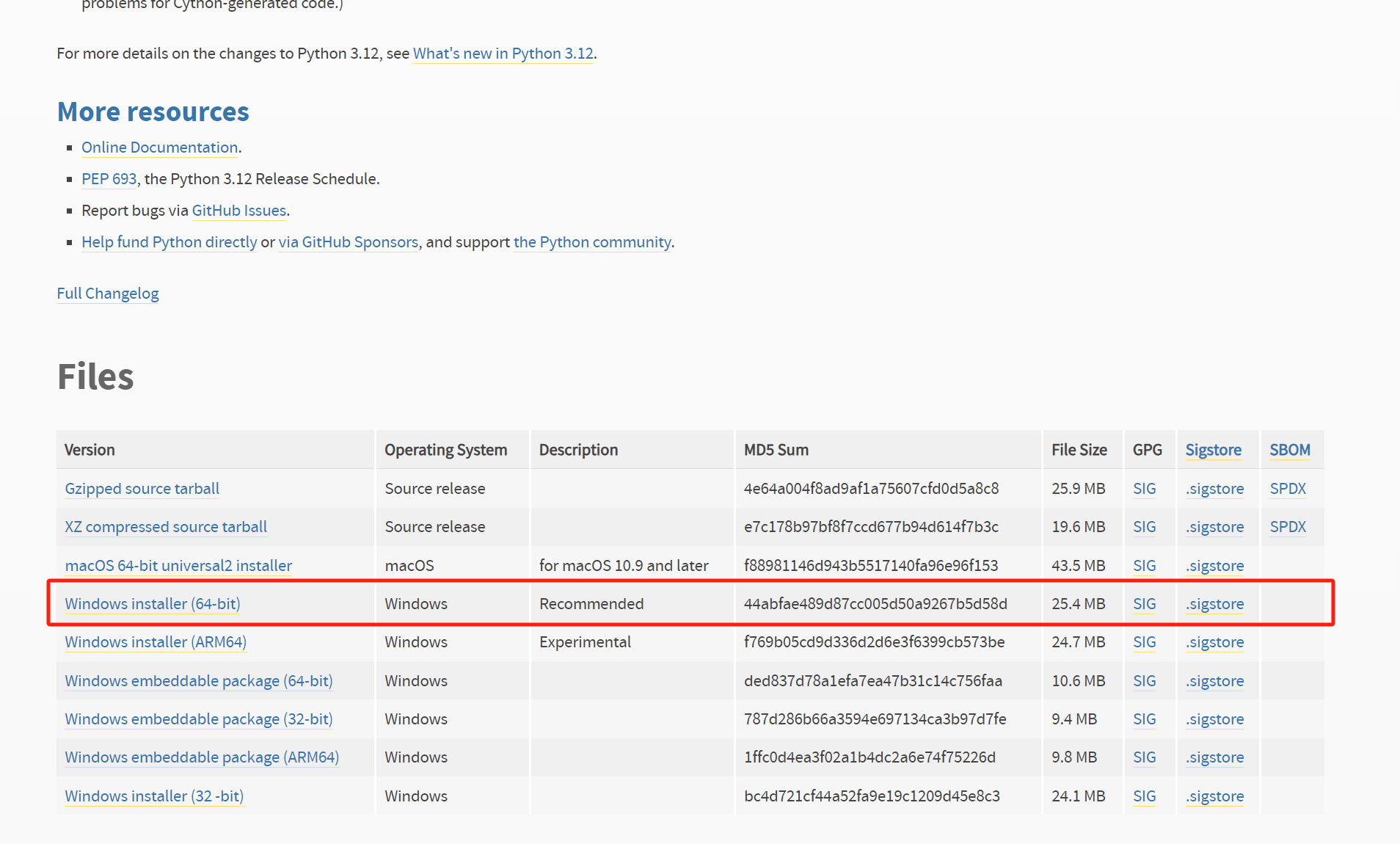 (3)网站会自动识别读者的电脑系统平台,点击按钮可以直接下载当前稳定的最新版本,因为我们使用的版本是 3.12.2,是当前最新的版本,可以直接点击下载,也可以点击对应平台的黄色链接,进入对应历史版本下载页面,例如需要下载 Windows 平台 64 位的 Python 安装包,选择 Windows installer(64-bit)。