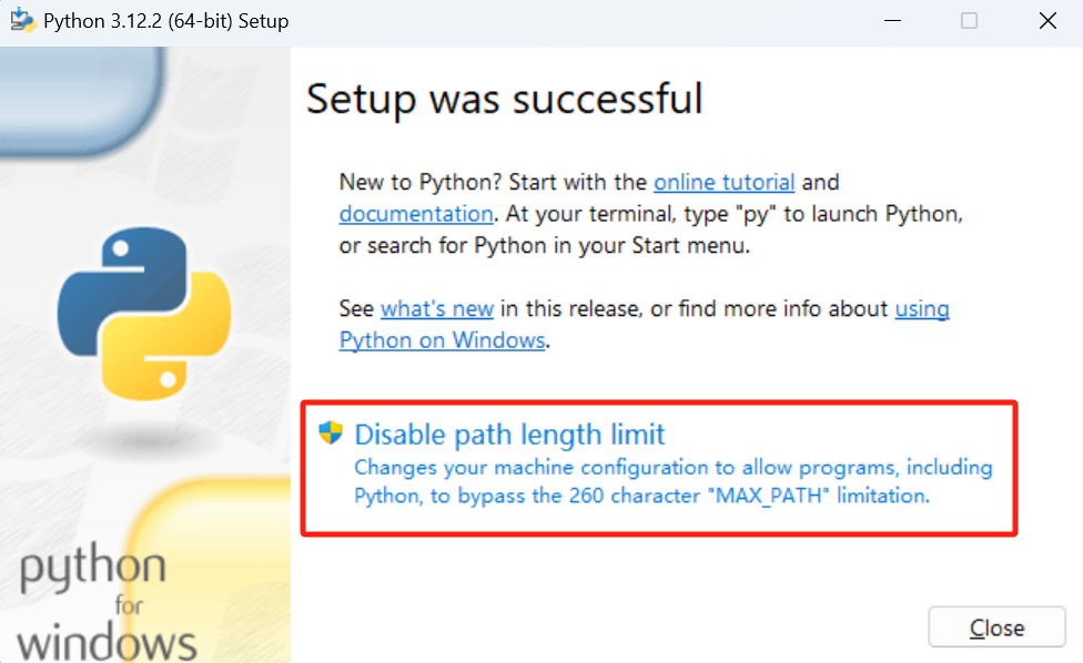 安装完成后,点击 “Disable path length limit” 选项来解除电脑对 Python 的一些限制。