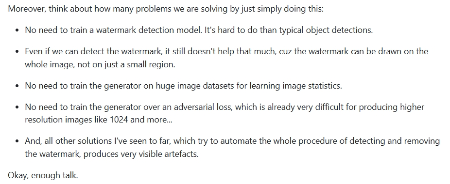 遗憾的是:这两个,无论用哪一个,你都逃不掉创建mask。为什么不能通过机器学习自己识别水印创建mask呢?Watermark-Removal-Pytorch项目的README中也给出了解释: