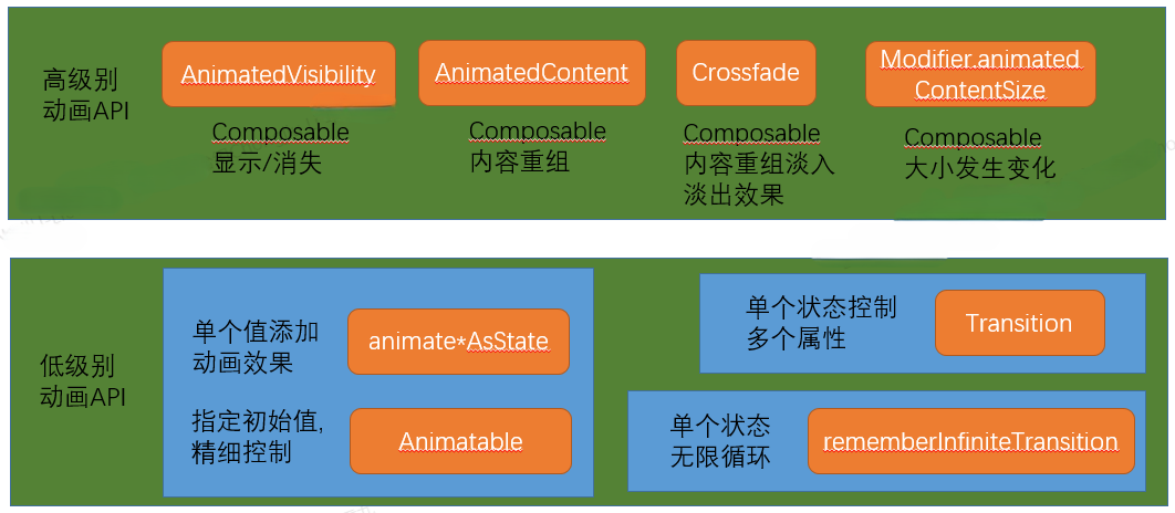 高级别动画 API 底层实现都是基于低级别动画 API,提供了一个开箱即用的 Composable 或 Modifier。