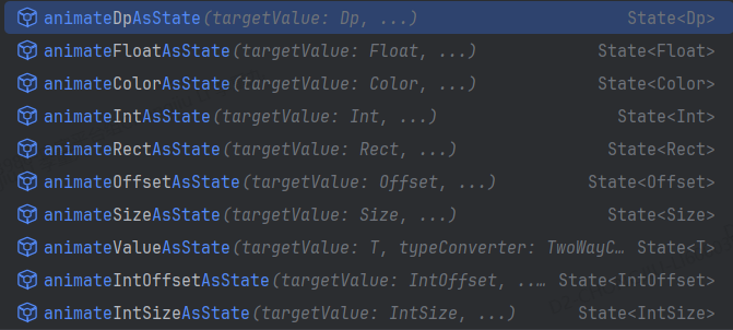 其实 animate*AsState 并不是只某一个具体方法,而是只形如 animate*AsState 的一系列方法,具体如下: