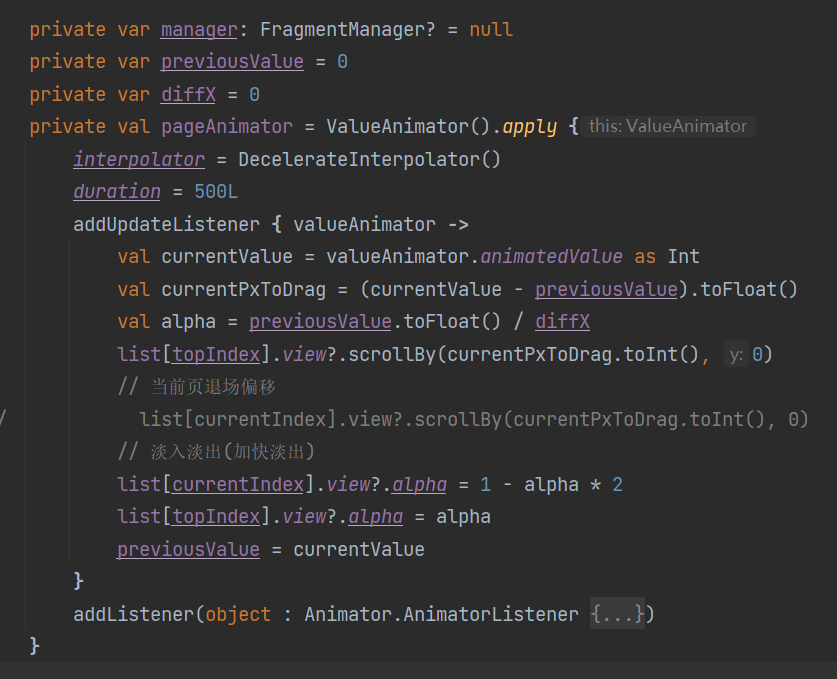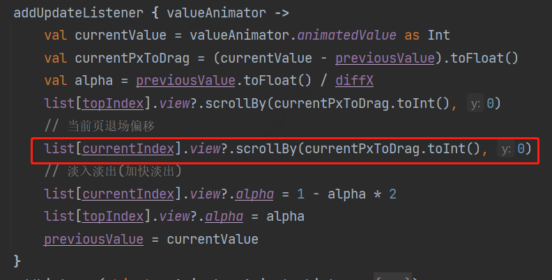 需要注意的是,因为属性动画变更了view的属性,所以stop结束后必须恢复,否则会有两个页面重叠的问题
