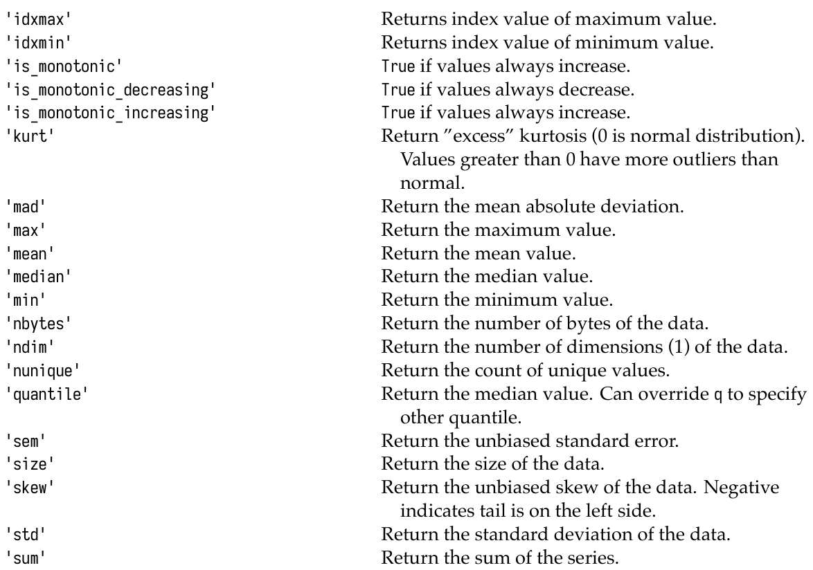 以下是.agg 方法接受的字符串。您也可以传入其他字符串,但它们将返回非聚合结果。向 .agg 传递字符串时,pandas 会将其映射到系列中的方法: