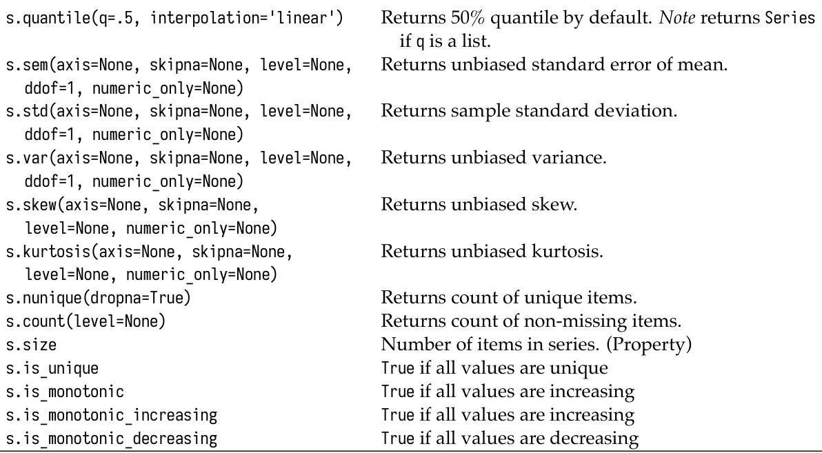 - 聚合方法和属性可将数列中的值缩小或聚合为单个标量值。例如,.mean、.max 和 .sum 方法以及 .is_monotonic 属性。