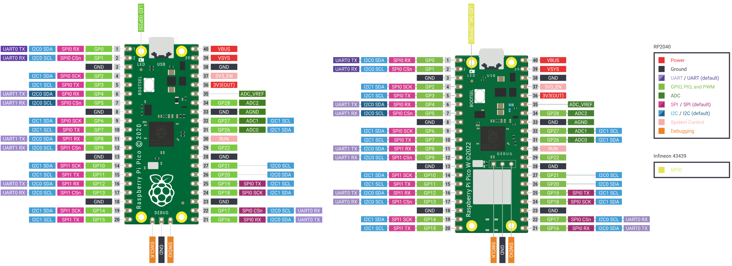 GPIO 是 General Purpose Input Output 的缩写,即“通用输入输出”。 Raspberry Pi Pico 左右两侧各有一列 GPIO 引脚, Pico 通过这两列引脚进行一些硬件上的扩展,与传感器进行交互等等。